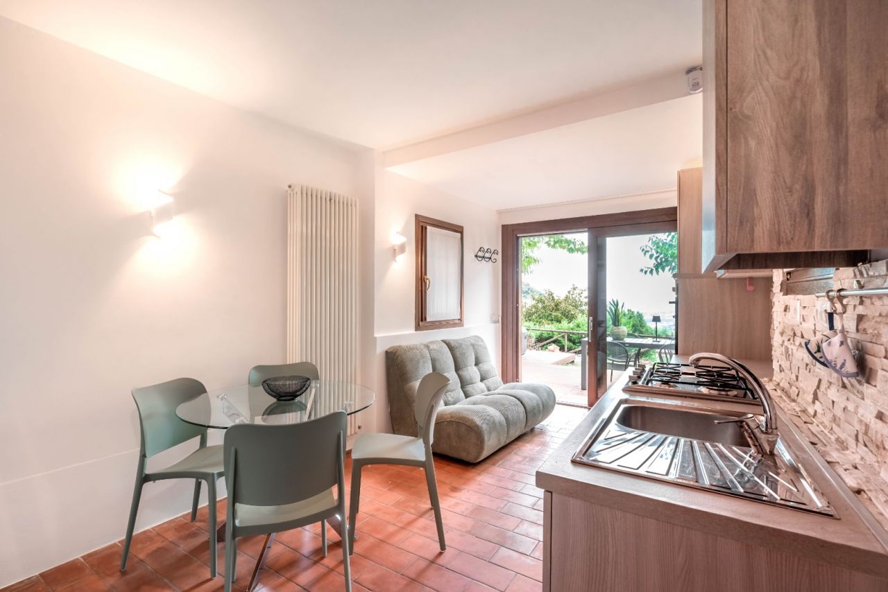 L’esterno è il vero punto forte della casa: un ampio giardino privato panoramico con vista sulla vallata, perfetto per rilassarsi o godersi un aperitivo al tramonto.